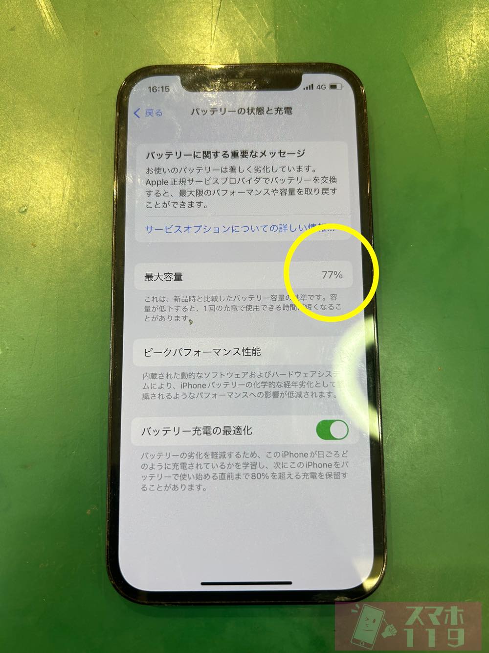 設定アプリから見れるバッテリーの最大容量が77%!!