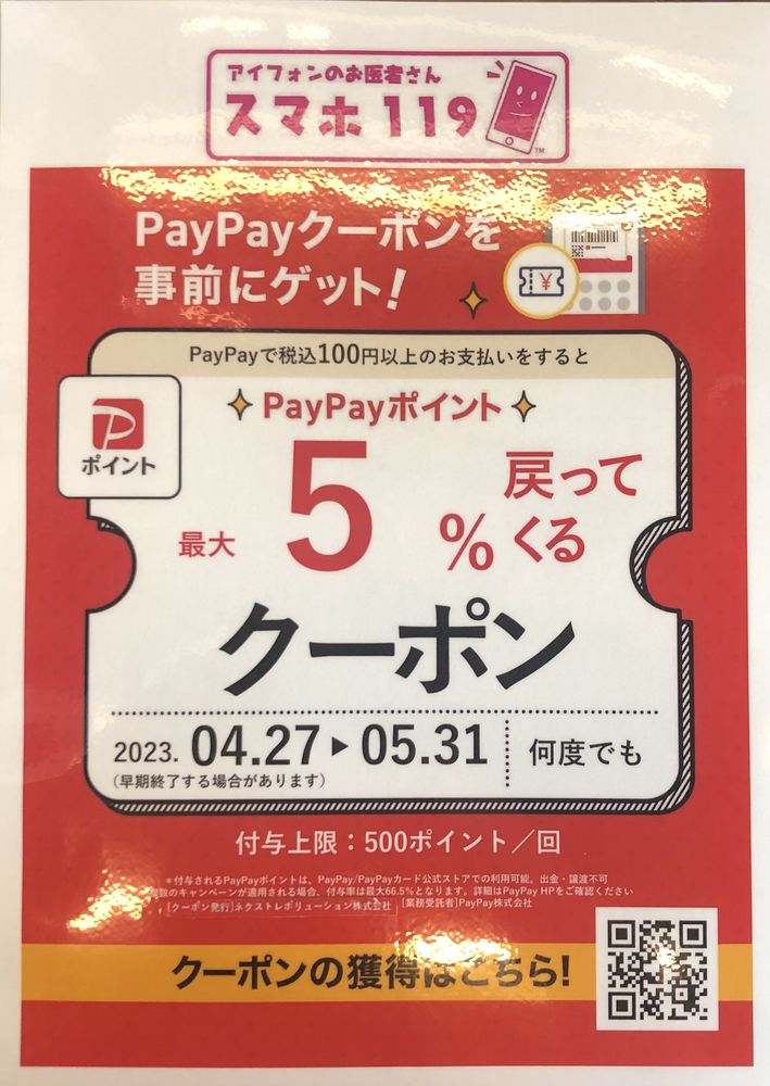 クーポンの獲得は上記のQRコードを読み取るかPayPayアプリにてスマホ119で検索してクーポンを発行‼︎