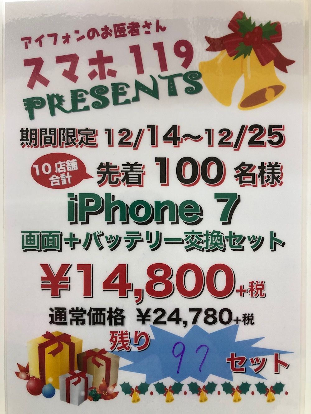 iphone7 画面+バッテリー交換セット(14800円+税) 残り94セット