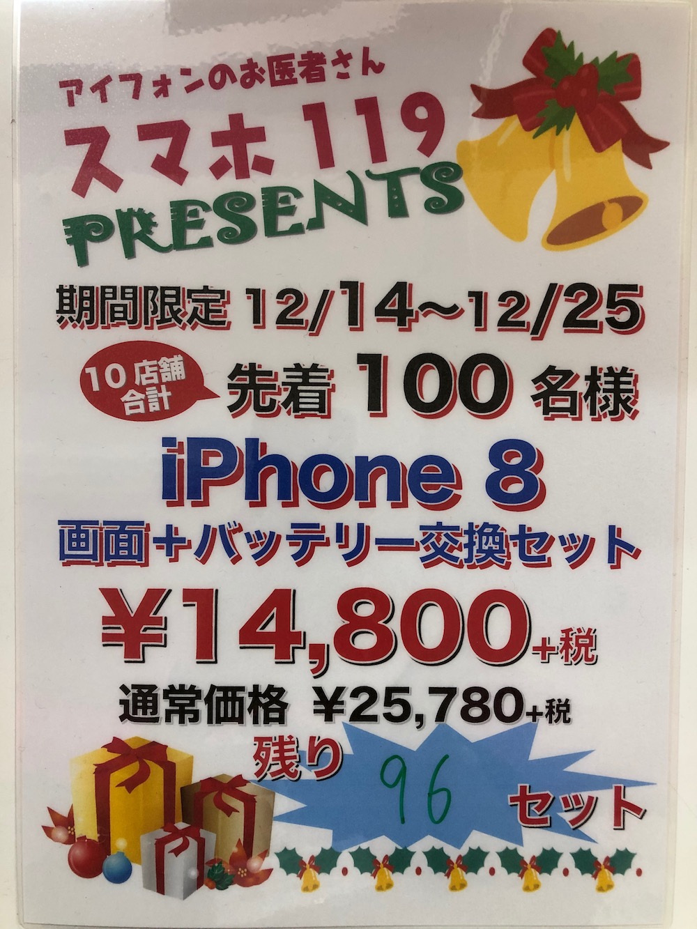 iphone8 画面+バッテリー交換セット(14800円+税) 残り94セット