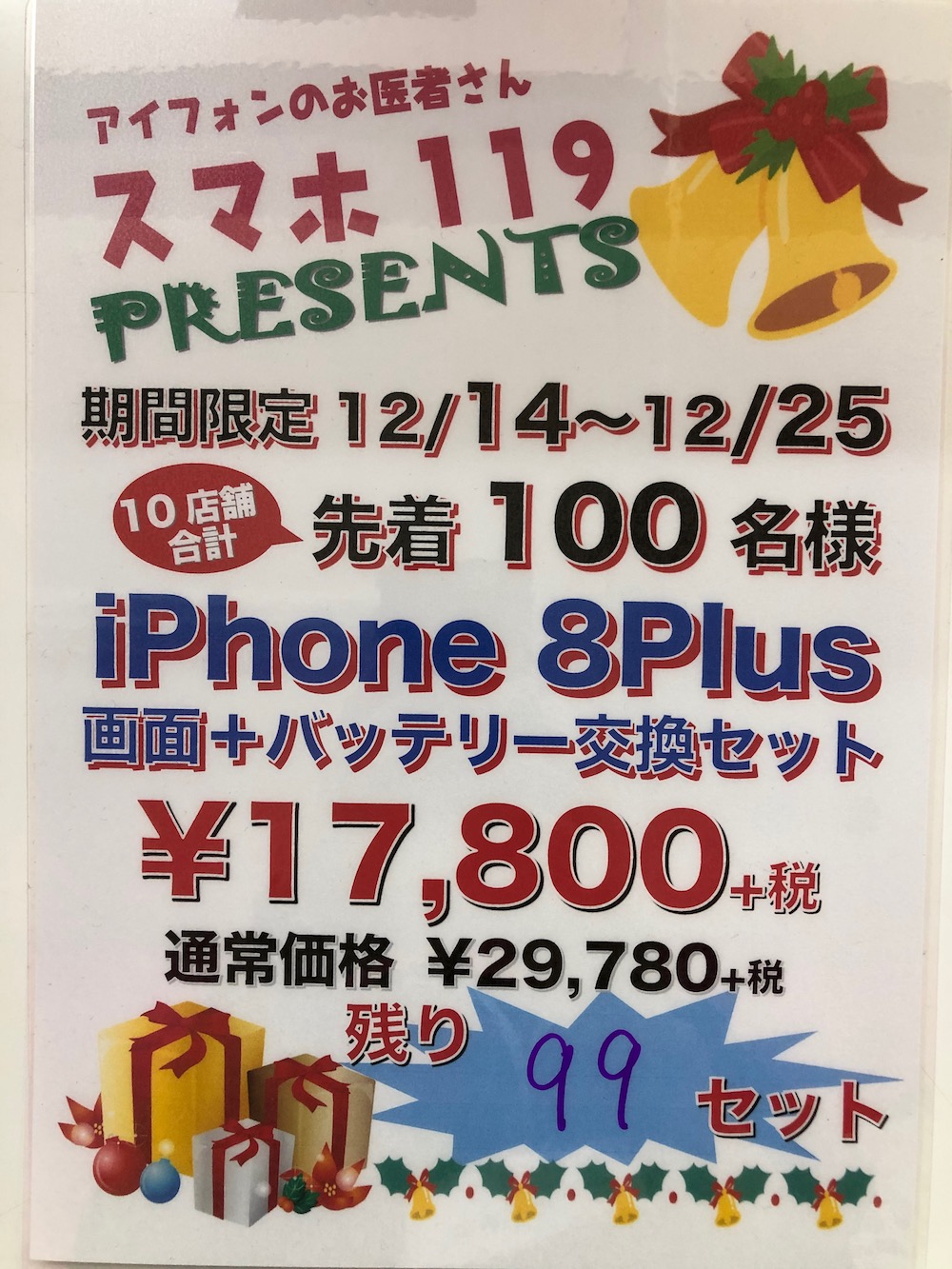iphone8plus 画面+バッテリー交換セット(17800円+税) 残り99セット
