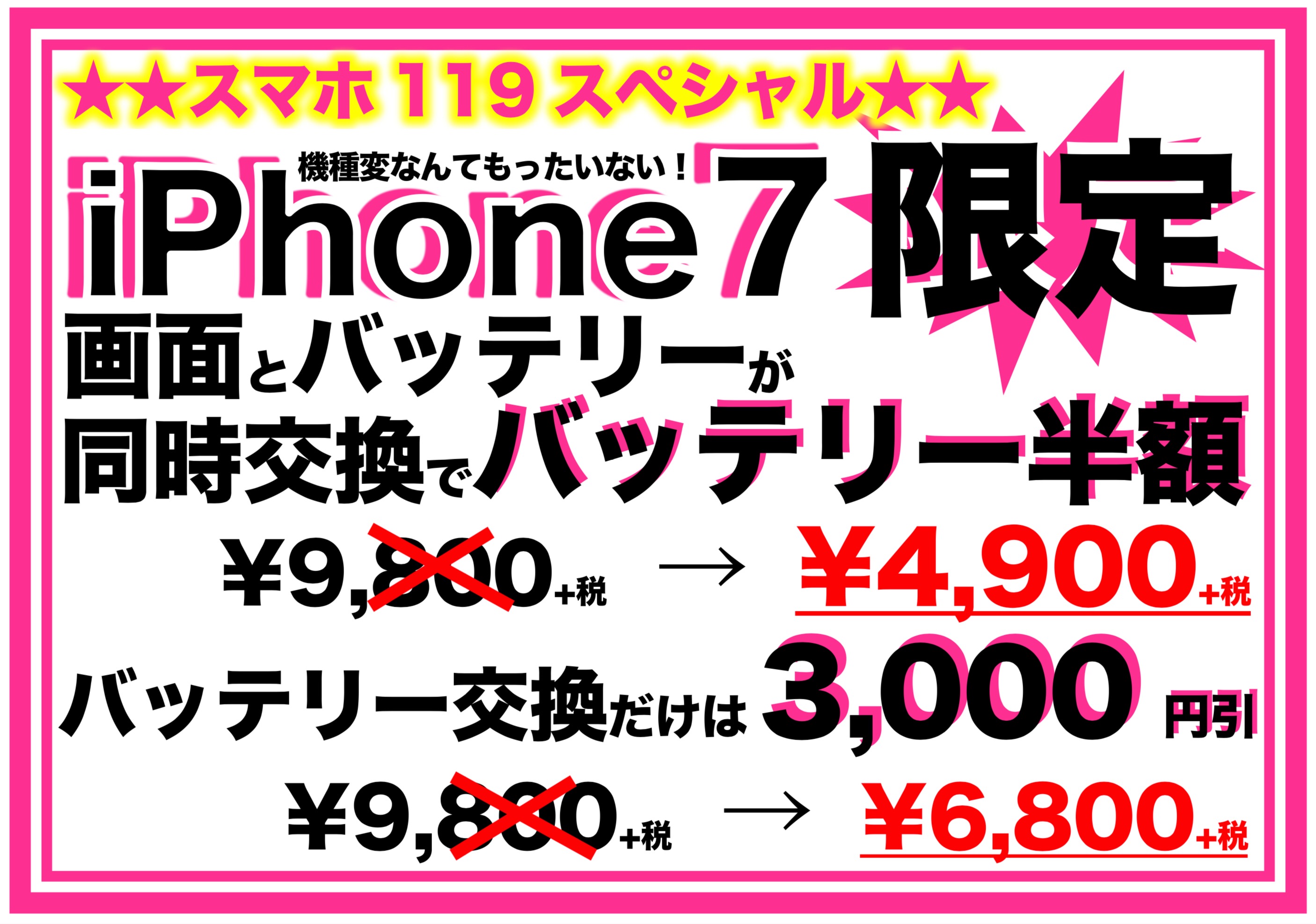 画面交換のお値段がこんなに安くなってます!みなさんこの機会にすまほ119へぜひ足を運んでくださいね!