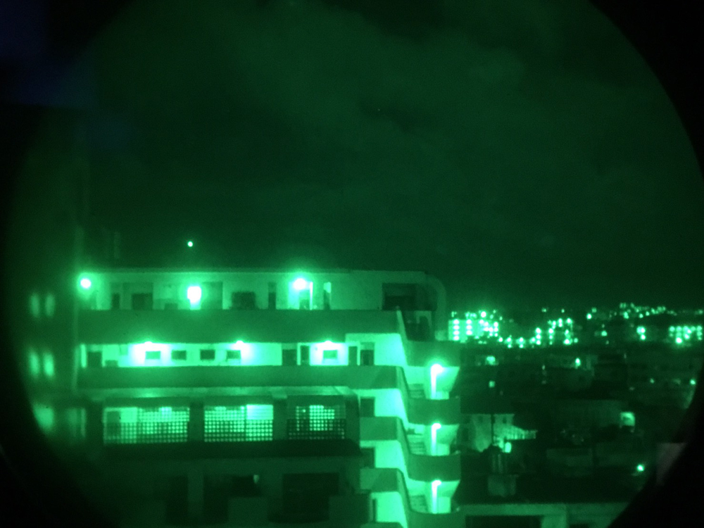 ちなみにこちらは湾岸戦争当時、米軍によるバグダットの空爆の模様を捕らえたニュース映像ですが、お察しのあなた、そうなんです、こんな緑色の世界を夜中の暗闇で見る事が出来る、それはそれはもう素敵な夜メガネなんでございます。