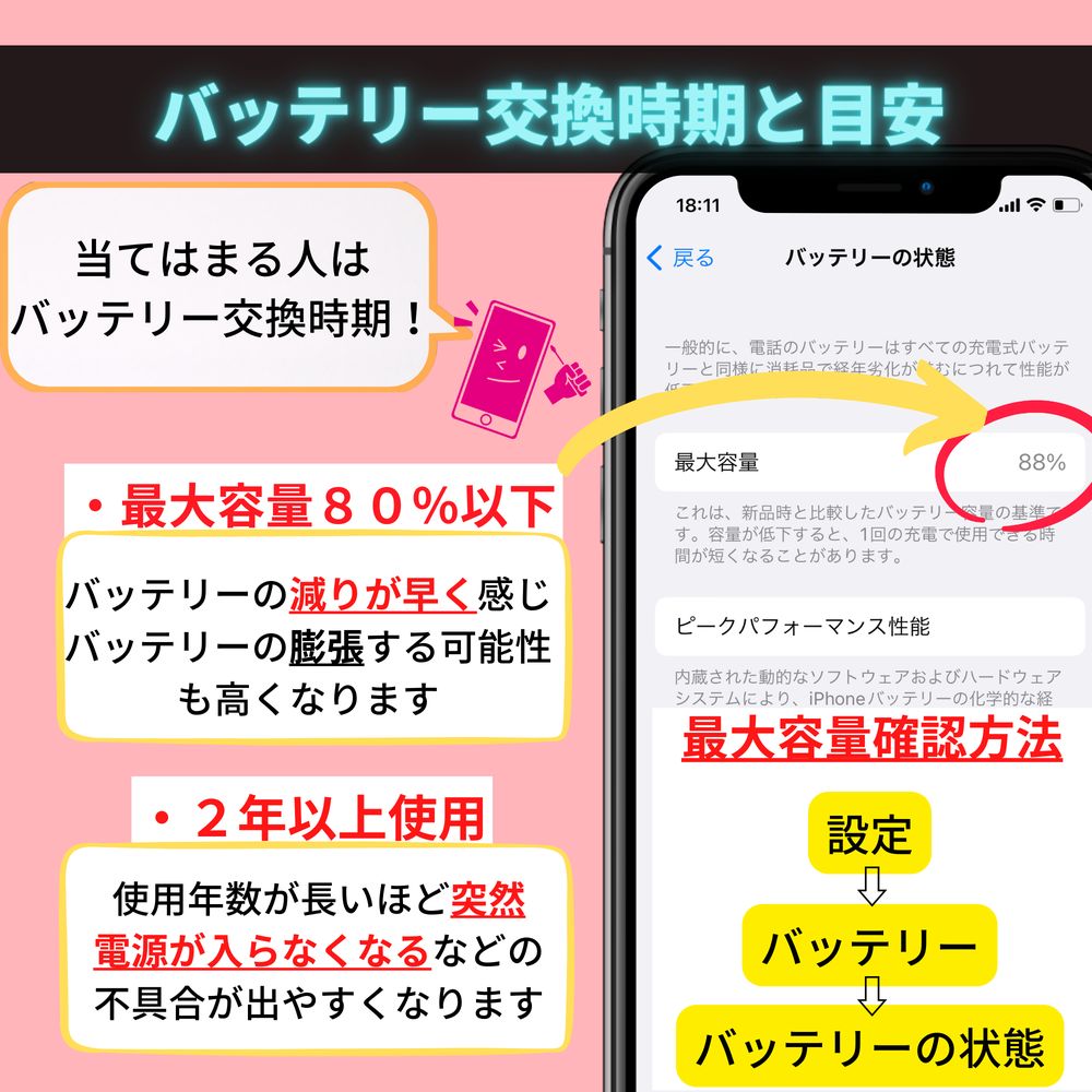 スマホのバッテリーの耐用年数は2〜3年と言われています