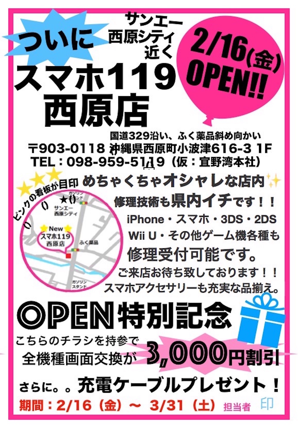 また、スマホ119西原店は現在、オープンセールとして3月末まで全機種画面交換3000円引きです!