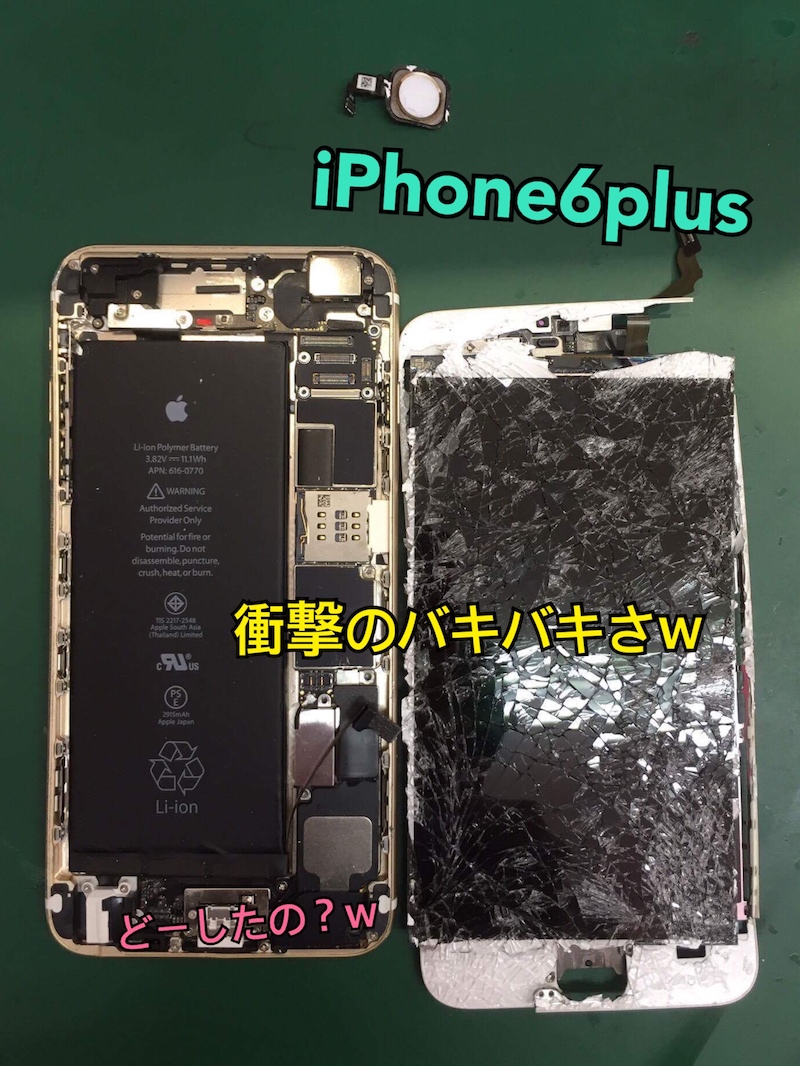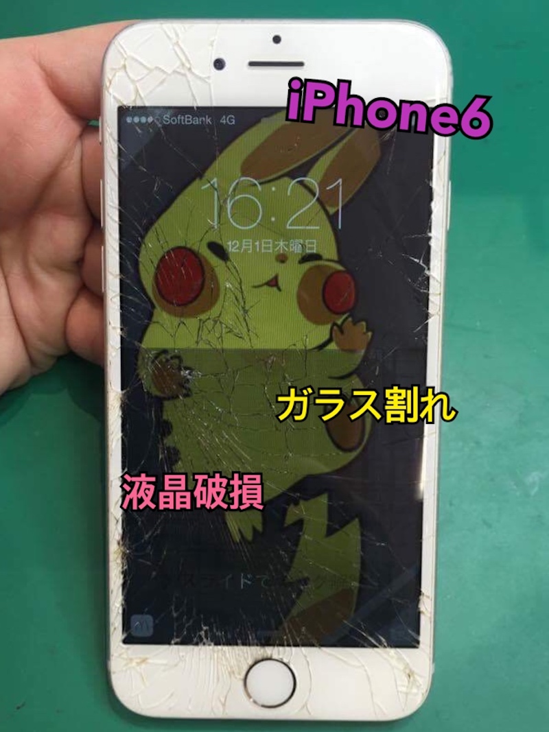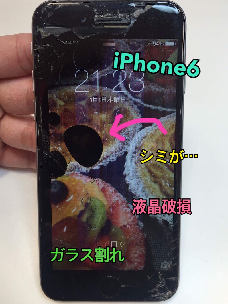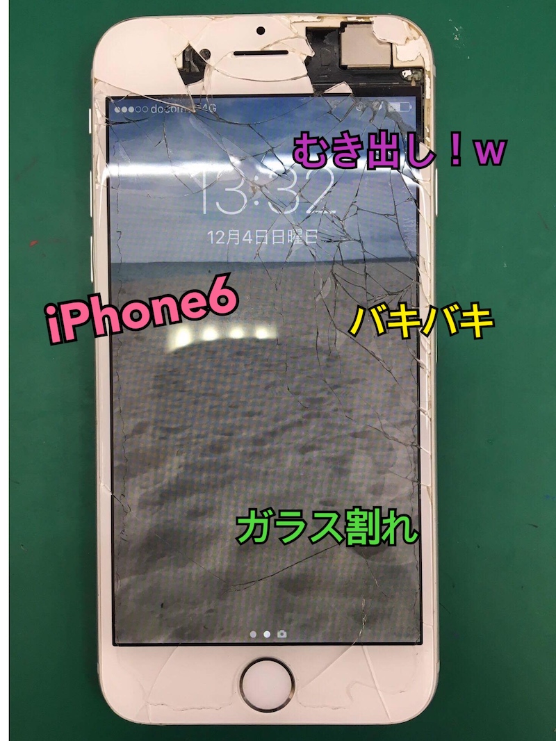 ↑ガラス割れのiPhone6。画面右上の破損が激しいですね。